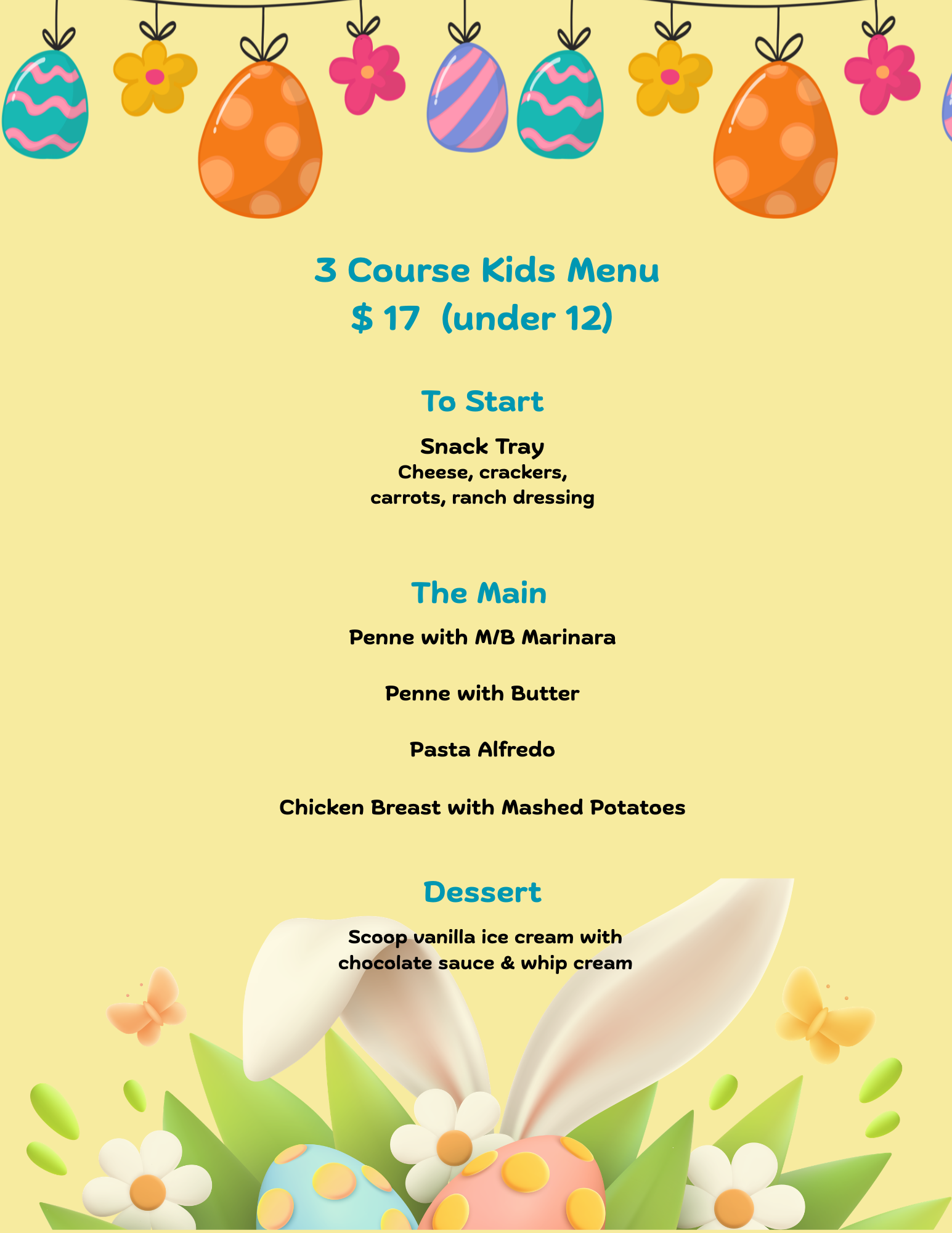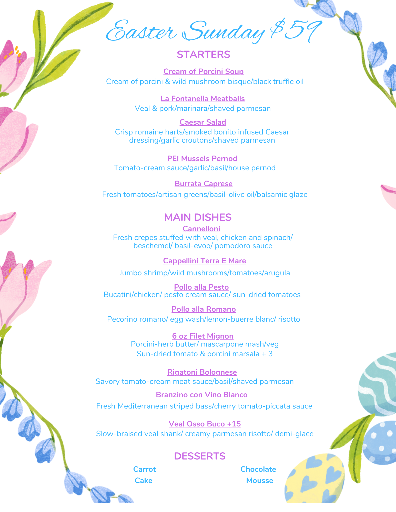 Both locations open at 3 pm on Easter Sunday. Please note that regular menu and Early Dining Special will not be available during this event.